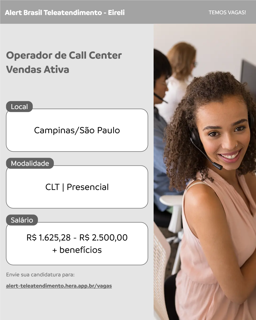 Somos da AlertBrasil e buscamos por candidatos para vaga de Operador de Call Center Ativo na área de vendas.